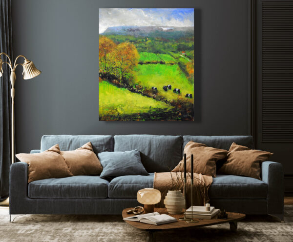 I like the visual joke of the painting – the White Horse isn’t real – it’s painted onto the landscape with chalk and the ‘real’ Belted Galloway Cattle aren’t real either – they’re painted onto the canvas. As a print, this has been one of my most popular pictures and that’s because of it’s familiarity to so many people. It has the first flush of Autumn about it but there are still lingering elements of Summer. In order to get the vivid colours necessary for the natural world I use Michael Harding paints when I’m working in oil, but for acrylic paintings such as this I use Golden. For pastels and coloured crayon I more often than not use Caran d’ashe.